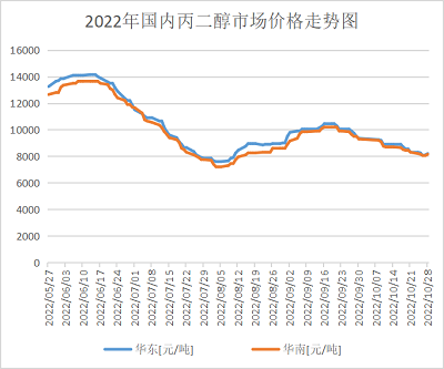 本月丙二醇价钱动摇下跌,如上。月内,山东均匀市场价钱为8456元/吨,较上月均匀价钱下跌1442元/吨,下跌15%,较客岁同期下跌65%。价钱延续下跌的首要缘由以下: